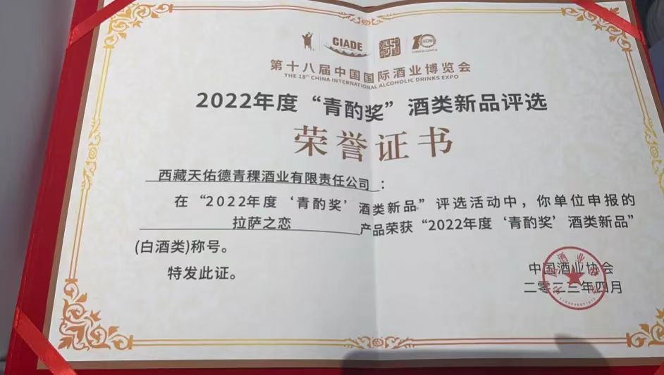 4 月 13 日,第十八屆中國國際酒業(yè)博覽會在瀘州國際會展中心開幕。本屆酒博會上,中國酒業(yè)協(xié)會發(fā)布了 2022 年度“青酌獎(jiǎng)”酒類新品榜單?!扒嘧锚?jiǎng)”有著“酒業(yè)奧斯卡”的美名,其重要性和含金量不言而喻, 西藏阿拉嘉寶高原酒莊青稞酒生產(chǎn)的阿拉嘉寶“拉薩之戀”經(jīng)過嚴(yán)苛評選脫穎而出,成功斬獲“青酌獎(jiǎng)”。