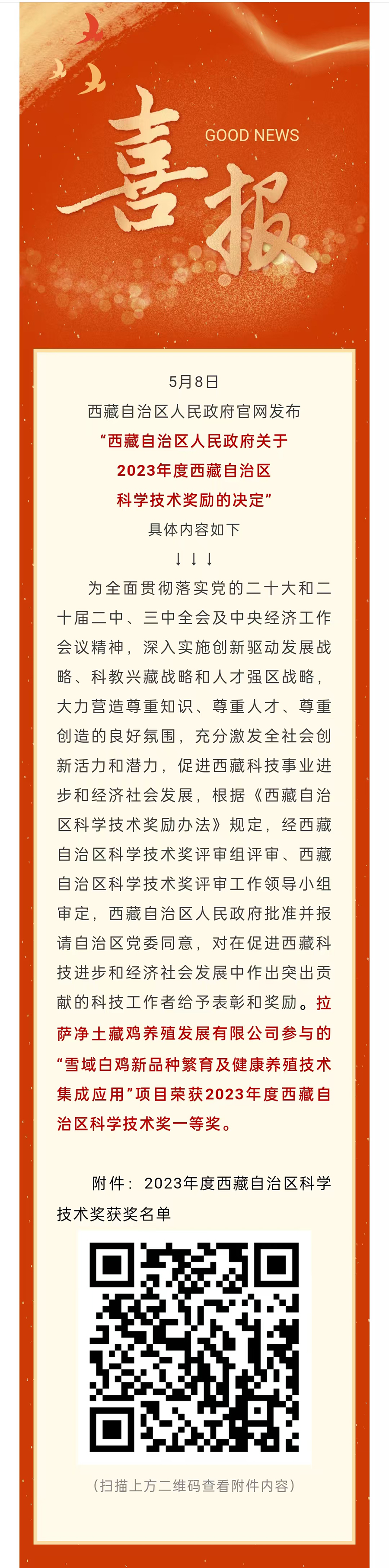 喜報(bào)!拉薩凈土藏雞養(yǎng)殖發(fā)展有限公司榮獲“雪域白雞新品種繁育及健康養(yǎng)殖技術(shù)集成應(yīng)用”項(xiàng)目一等獎(jiǎng)