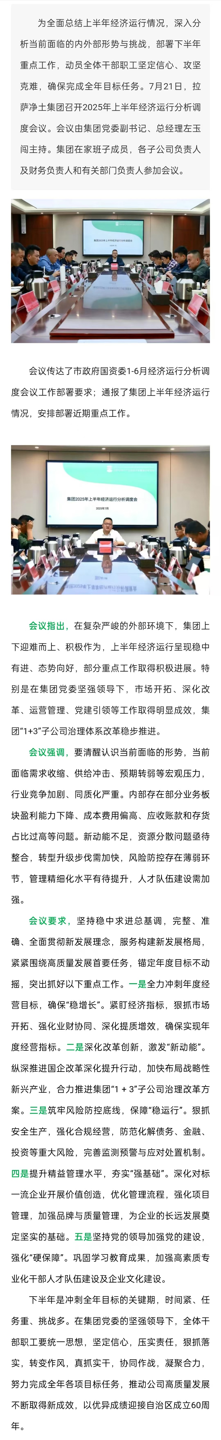 錨定目標(biāo) 加壓奮進(jìn) 以實(shí)干實(shí)績(jī)推動(dòng)高質(zhì)量發(fā)展邁上新臺(tái)階——拉薩凈土集團(tuán)召開2025年上半年經(jīng)濟(jì)運(yùn)行分析調(diào)度會(huì)議