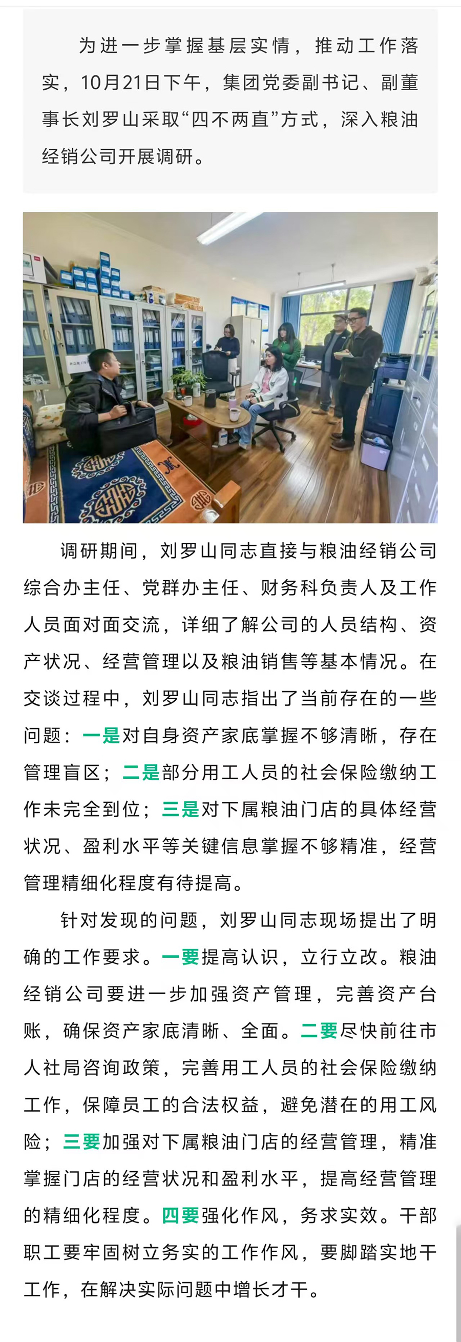 集團黨委副書記以“四不兩直”方式深入糧油經(jīng)銷公司調(diào)研指導工作