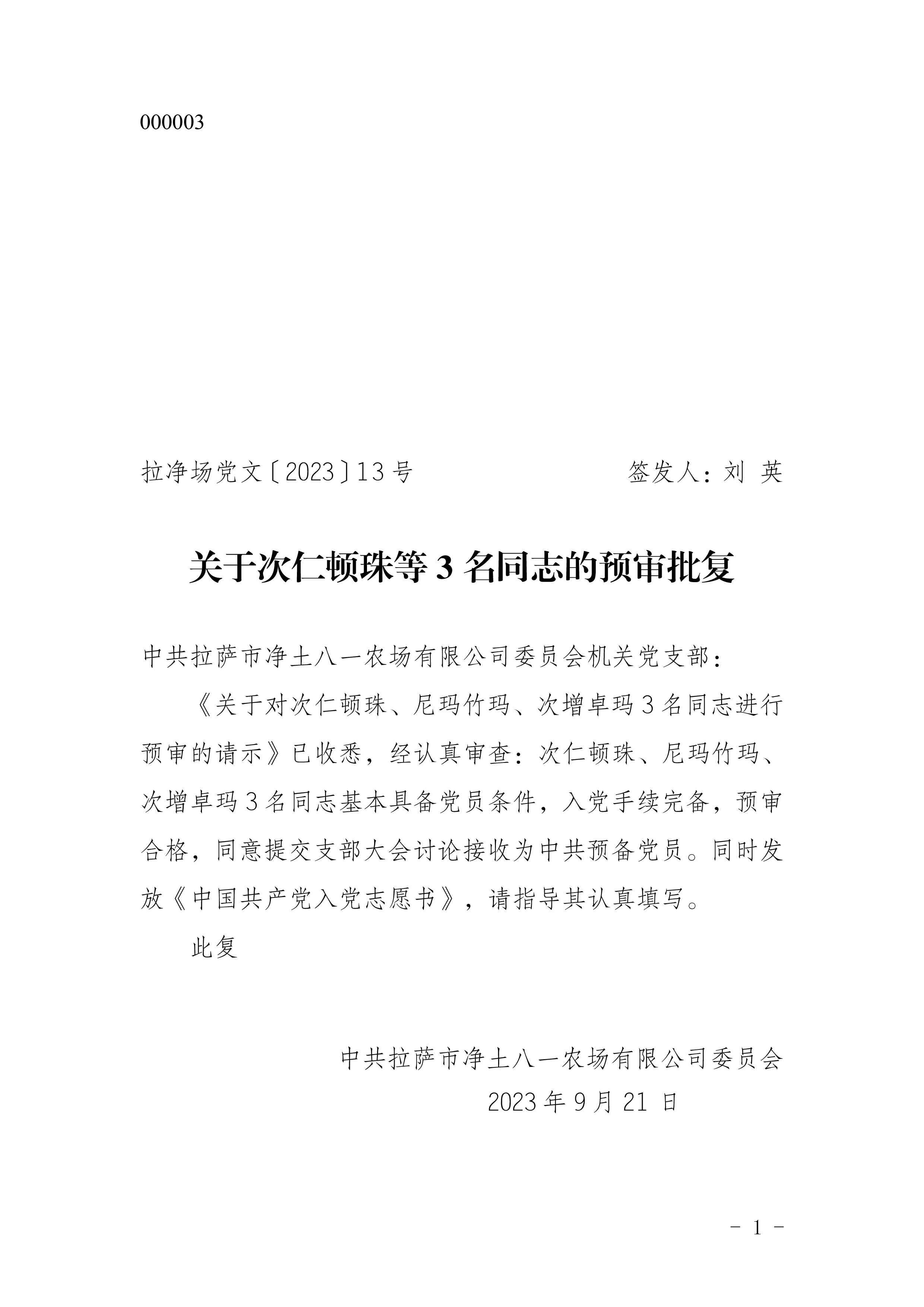 關(guān)于次仁頓珠等3名同志的預(yù)審批復