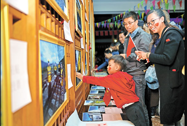 9月28日,旅客在參觀拉薩火車站舉辦的攝影展。記者 丹增群培 攝